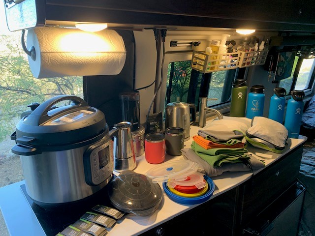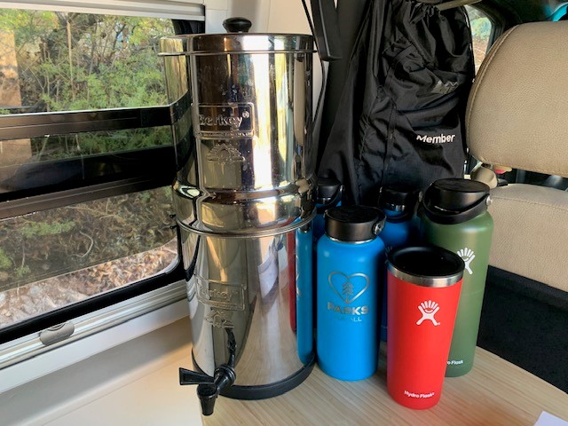 So why these items? We find these items help us with everyday living. We try to find items that take up as little space as possible, are the most affordable and durable (as everyone who knows me, I am the Samsonite Gorilla when it comes to using items-if it can break, I will find a way to break it). First item on the list, is the Instant Pot! Being able to cook a full meal in one pot and typically in less than 30 minutes makes life easy and efficient! Plus, when you are doing the dishes it makes clean-up so much easier in a tiny space. When it comes to cooking, we use these items every day. The Instant Pot usually makes about 2-3 meals for a couple so these collapsible containers are great for storing leftovers and pack away nicely. I also like to steam my vegetables instead of them overcooking in the instant pot, this steamer does the trick in the microwave. We love our Espresso and our cooktop is induction so you must have a special induction coffee maker. This Induction Italian Espresso Maker makes the perfect espresso to fit in our Hydroflask Coffee Mugs (keeps your coffee nice and hot and spill proof, especially good for me as a clutz I am in the morning). We like to grind fresh coffee beans each morning, makes a wonderful scent throughout the van, this Coffee Grinder is durable and small to store. I also love the Hydroflask Wine Glasses, this way you don’t have to worry about glass breaking in your van and it keeps your wine the perfect temperature. There are so many recipes that require boiled water and if you are a tea lover, having boiling water in a couple minutes is great. We use this electric kettle every day. Getting your paper towels out of the way but in easy reach is important. I am surprised many RVs don’t come with a paper towel holder, we like the modern look of this paper towel holder and its durability. When you are living in less than 25 square feet if something can be used in multiple ways it is especially beneficial. We love Dr. Bronner’s Soap as it can be used as hand soap, dish soap, shower body soap and washing clothes soap. It is biodegradable and won’t hurt the environment and if you have dry skin we find it doesn’t dry you out. My favorite is the Dr. Bonner’s Liquid Lavender Soap. A lot of RVers worry about the fresh water in their water tanks and if its clean and how often to clean the tanks and how to clean the tanks. We solved this by getting a Berkey Water Filter. We love this, the water taste fantastic and we use it every day! If you have a hard time falling asleep like Greg and I do, we are huge fans of cbdMD Sleep Tincture. Bode is almost 11 years old and is a big fan of their cbdMD dog treats (really calms him down and he thinks they are super tasty) and the cbdMD Hip and Joint Soft Chews really helps his hips if he goes on too long of a walk or hike with us.