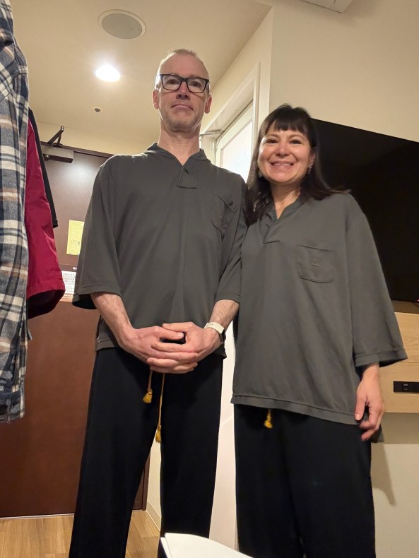 Then came the onsen experience. Picture tiny wooden stools, organic soaps, and a little bucket to rinse yourself before entering a steaming natural pool that makes a hot tub feel lukewarm. I had the whole place to myself for 20 glorious minutes. Afterwards, I tested every lotion and face wash in the women’s lounge like a kid in a very polite, very quiet candy store. Greg also had his onsen to himself but he wasn’t an explorer he raced back to the room to shower in peace and not have to figure out how to use the stiil and very short shower head.