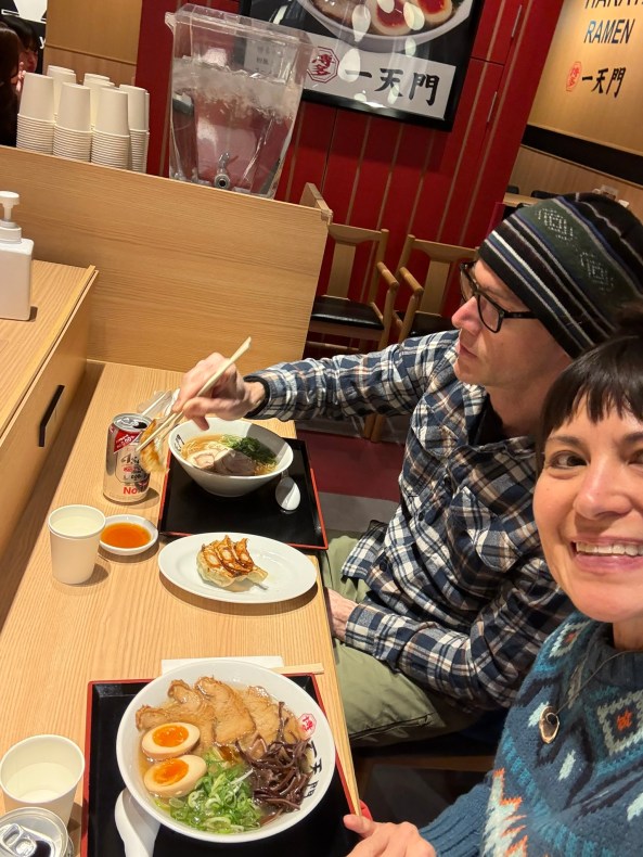 Everyone’s been absurdly friendly and helpful, it’s like they’re training for some kind of niceness Olympics! The shuttle ride from the airport to the nearby hotel was so smooth, I almost needed a wake-up call to alert me we arrived, and by smooth, I mean I drooled a bit on the window. Later we found out it would have been an easy 2 mile walk when we headed to ramen for dinner that was back at Terminal 3-HA! Let me tell you, the cheap $7 a bowl treat at the airport you can’t go wrong! Then, a speedy jaunt to a super clean ramen joint for dinner, my taste buds are doing the cha cha slide! Their zero beer (Asahi) has a fantastic flavor, low calories and a funny quote about making work the next day easy, too bad that’s not my friend today!